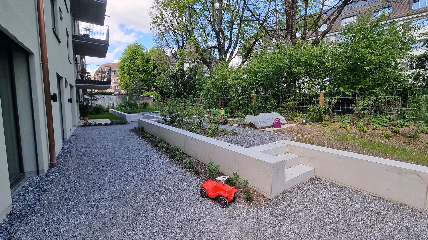 Klare Linien, ruhige Formen und beständige Materialien verleihen dem Aussenraum Struktur. Verschiedene Oberflächen und Farben sorgen für Abwechslung und Ausdruck.