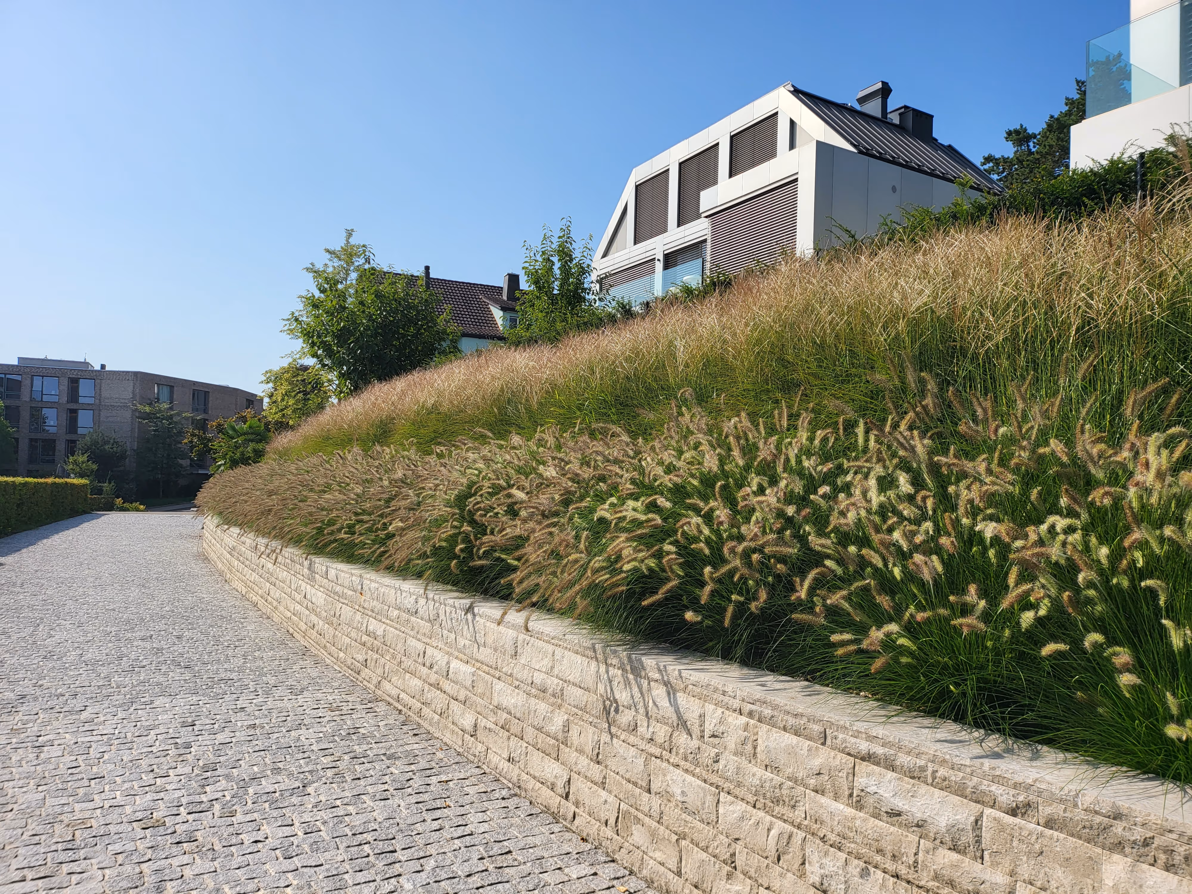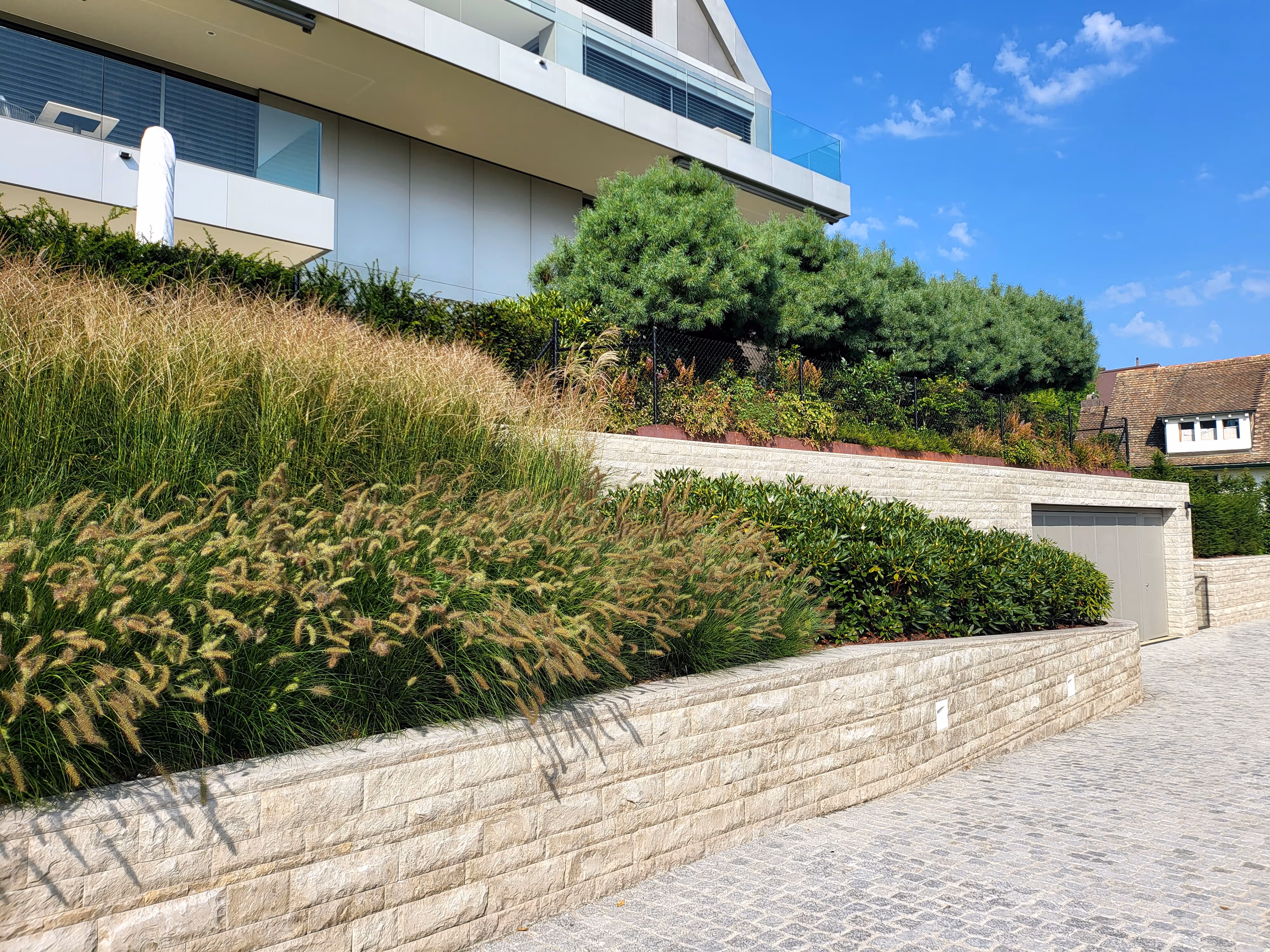 Besonderheiten: Mauerverkleidungen aus Kalkstein in Kombination mit Granitpflästerungen.Die gesamte Umgebung wird automatisch und der Witterung angepasst bewässert
